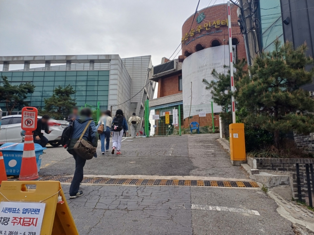 오전 8시가 채 되기 전부터 투표하러 온 유권자들이 적지 않았다. 투표소로 향하는 오르막길을 오르자 선거사무원이 투표소 입구 양옆에 서있었다. 이들은 들어서는 유권자들에게 "동네가 어디세요" "어느지역에서 오셨어요"를 묻고 관외 투표는 보라색 화살표를 따라 좌측으로, 관내 투표는 초록색 화살표를 따라 우측으로 안내했다.