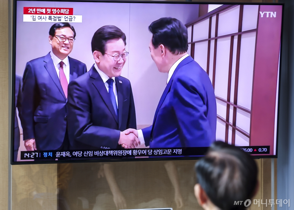 ![[서울=뉴시스] 정병혁 기자 = 29일 서울 중구 서울역 대합실에서 시민들이 TV를 통해 윤석열 대통령과 이재명 더불어민주당 대표의 영수회담을 바라보고 있다. 2024.04.29. jhope@newsis.com /사진=정병혁](https://thumb.mt.co.kr/cdn-cgi/image/f=avif/21/2024/04/2024042915103320045_1.jpg)