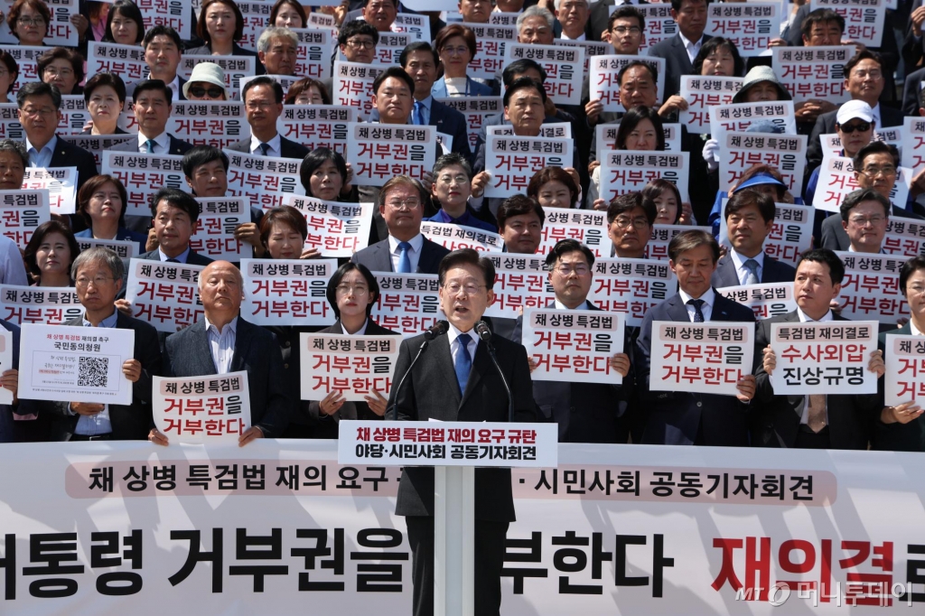 더불어민주당과 조국혁신당 등 범야권이 '채상병 특검법'(해병대 채상병 사망사건 외압 의혹 특별검사법안)에 대한 윤석열 대통령의 재의 요구(거부권 행사)를 규탄하는 공동기자회견을 열었다. 이재명 더불어민주당 대표는 기자회견에서 "'특검을 거부하는 자가 범인'이라고 말한 윤 대통령이 채상병 특검법을 거부하며 범인임을 자백했으니, 이제 책임을 물어야 한다"고 주장했다.