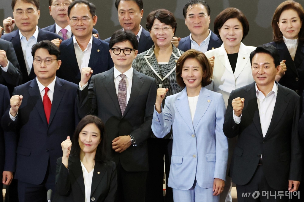 ![[서울=뉴시스] 조성우 기자 = 국민의힘 당 대표 경선 출마를 선언한 윤상현(아랫줄 왼쪽부터) 의원, 한동훈 전 비상대책위원장, 나경원 의원, 원희룡 전 국토교통부 장관이 24일 오전 서울 여의도 국회 의원회관에서 열린 국민의힘 초선의원 공부모임에 참석해 기념촬영하고 있다. 2024.06.24. xconfind@newsis.com /사진=조성우](https://thumb.mt.co.kr/cdn-cgi/image/f=avif/21/2024/06/2024062518121936630_1.jpg)