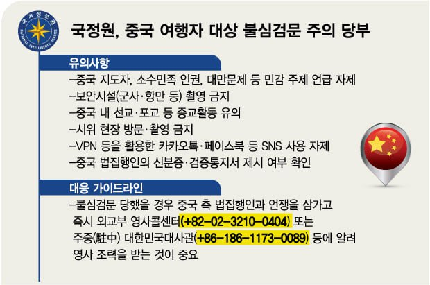중국 국가안전부는 지난해 12월 '중국의 경제쇠퇴', '외자 배척', '민영기업 탄압' 등을 주장하거나 관련 정보를 유포하면 단속·처벌하겠다고 밝혔다. 중국을 방문할 경우 스마트폰·노트북 등에 저장된 메시지·사진 등에 대한 관리도 필요하다는 게 정보당국의 설명이다.