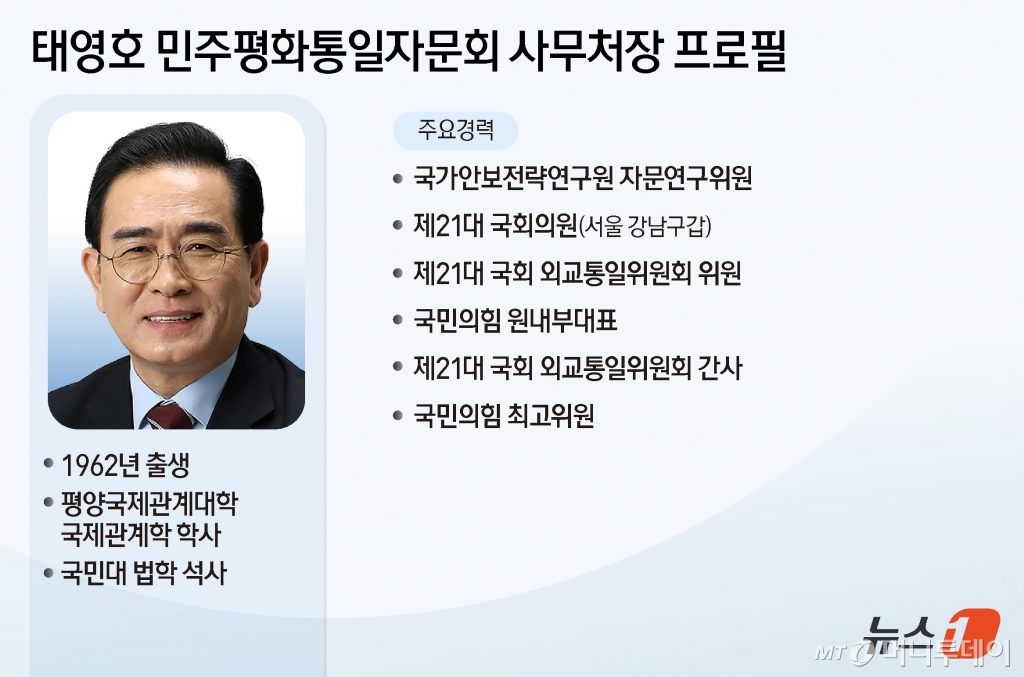 대통령실은 태 사무처장에 대해 "북한 실상에 대한 생생한 경험과 국회 외통위에서 활동한 전문성을 바탕으로 자유민주주의에 기반한 평화통일 정책 수립을 지원하고 국·내외 지지를 이끌어낼 적임자"라고 했다.