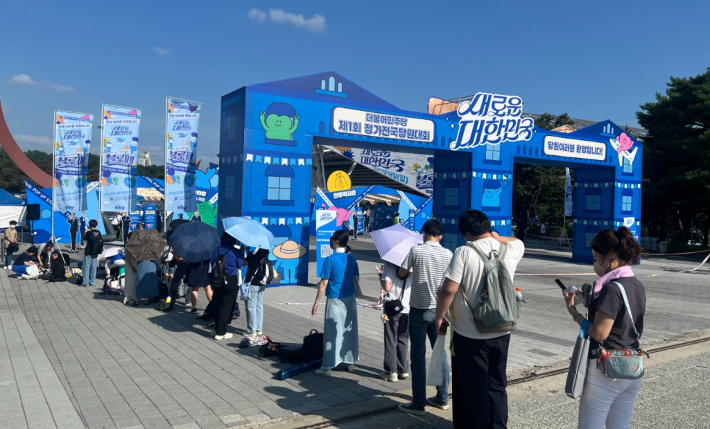 이날 행사 시작 한 시간 전인 오전 9시쯤부터 서울 송파구 올림픽공원 한얼광장에 마련된 팝업스토어 앞에서는 민주당 굿즈(기획상품)를 사려는 당원 40여 명이 줄을 섰다. 이미 30도를 넘어선 날씨에 이들은 양산을 쓰고 손 선풍기와 얼음물로 열을 식히며 입장을 기다렸다.