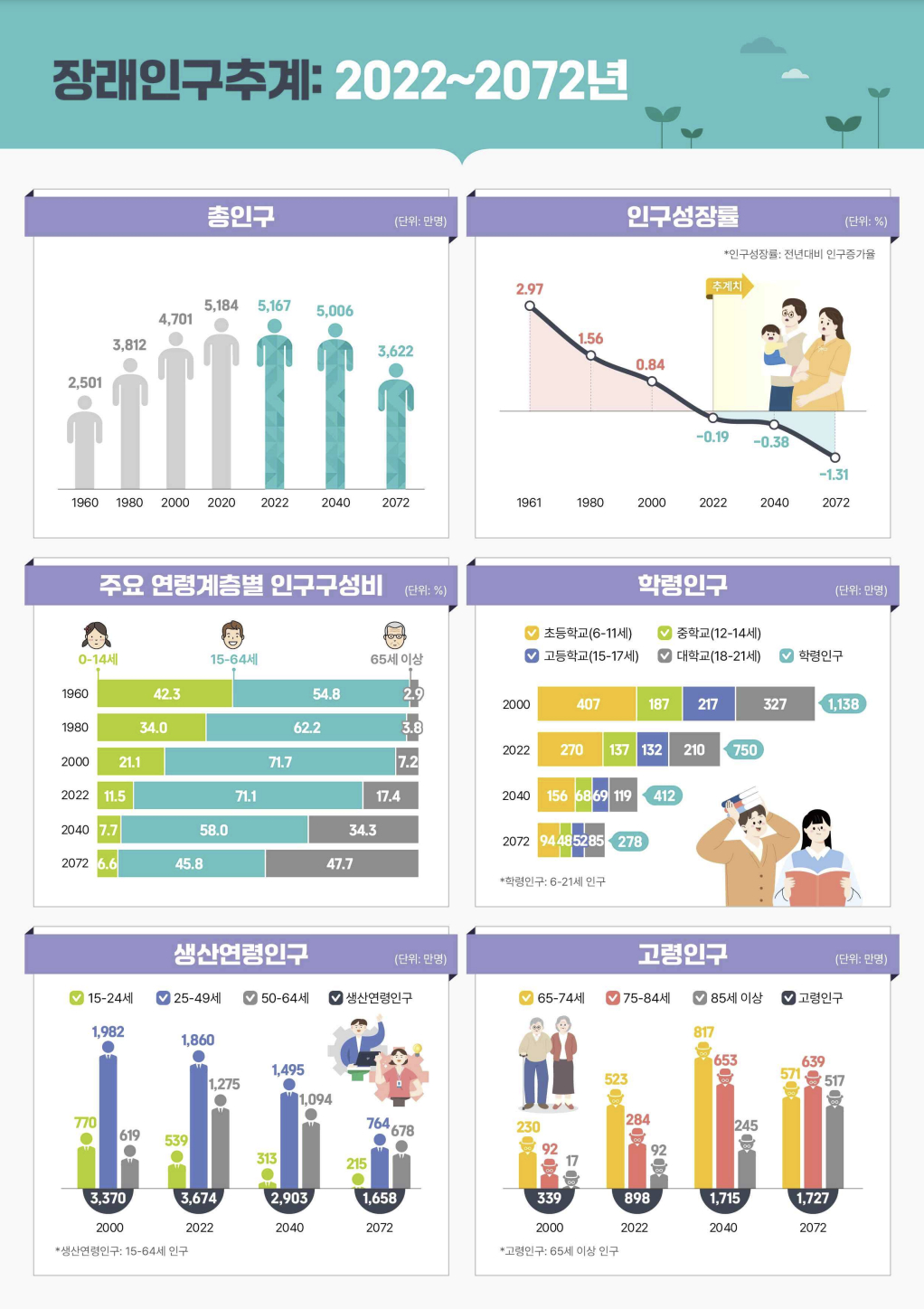 15~64세 생산연령인구는 2022년 3674만명에서 향후 10년간 332만명씩 줄어들어 2072년 1658만명에 그친다. 반면 2022년 898만명인 고령인구는 2025년 1000만명을 넘고 2072년에는 1727만명까지 불어날 것으로 추산됐다. 앞으로 50년 내 고령인구가 생산연령인구를 넘어선다는 얘기다.