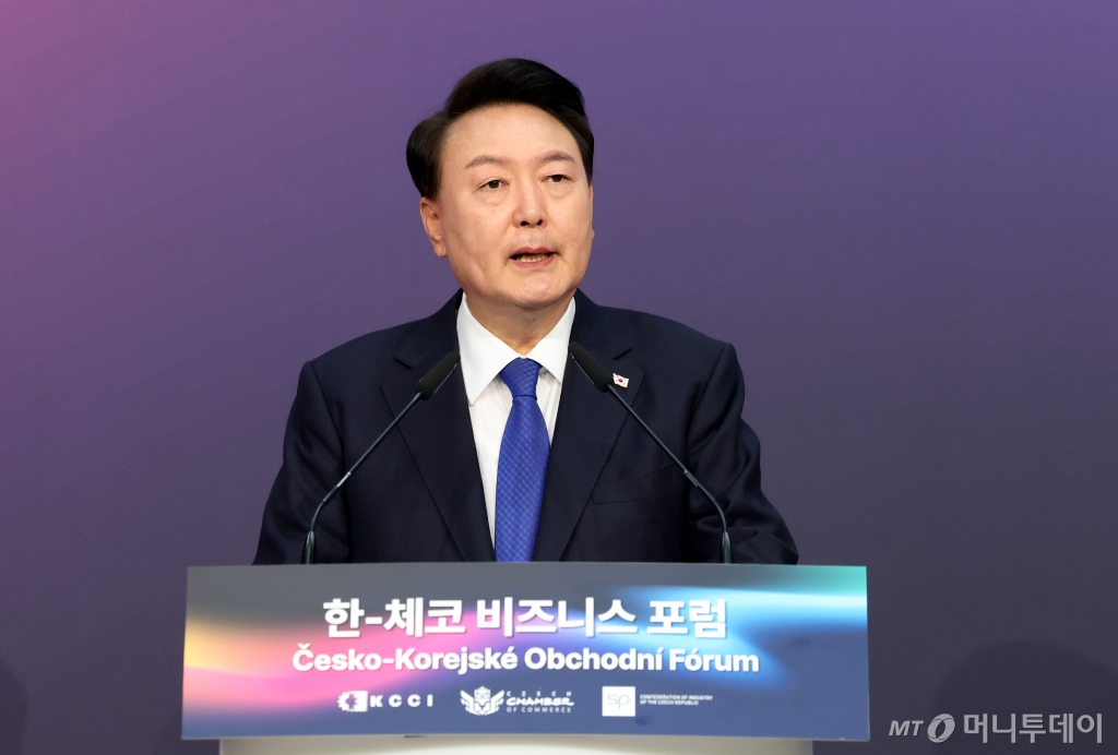 ![[프라하=뉴시스] 조수정 기자 = 체코를 공식 방문한 윤석열 대통령이 20일(현지시각) 프라하 한 호텔에서 열린 한-체코 비즈니스포럼에서 기조연설을 하고 있다. 2024.09.20. chocrystal@newsis.com /사진=조수정](https://thumb.mt.co.kr/cdn-cgi/image/f=avif/21/2024/09/2024092015504791686_1.jpg)