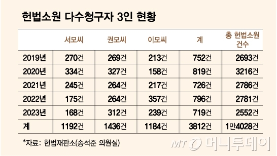 2일 국회 법제사법위원회 소속 송석준 국민의힘 의원(경기 이천시)에게 헌법재판소가 제출한 자료에 따르면, 최근 5년간(2019~2023년) 헌법소원청구를 남발한 상위 3명(권모씨, 서모씨, 이모씨)이 전체 헌법소원에서 차지하는 비중이 27.2%에 육박하는 것으로 집계됐다.