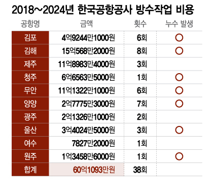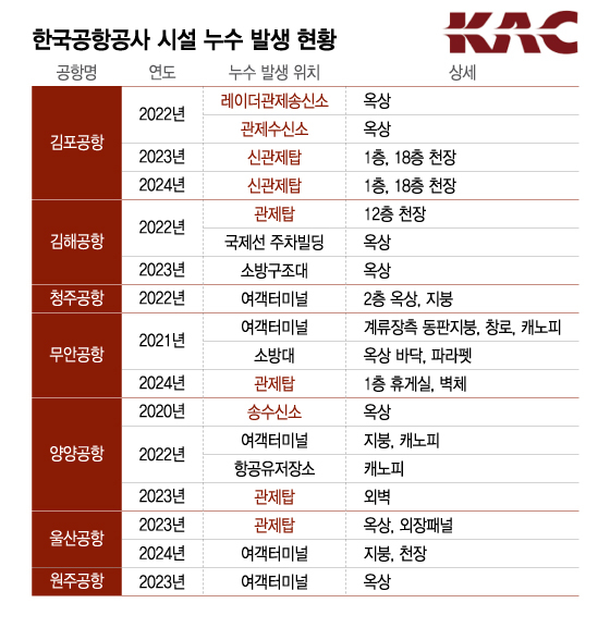 21일 국회 국토교통위원회 소속 더불어민주당 손명수 의원이 공항공사로부터 제출받은 자료에 따르면 2018년부터 2024년까지 공항공사가 운영하는 14개 공항 중 7개 공항에서 총 18차례의 시설 누수가 발생했다. 이 중 절반(9건)은 관제탑·관제송수신소 등 관제시설에서 나타난 누수였다. 공항별로 보면 김포공항에서 세 차례, 양양공항에서 두 차례, 김해·무안·울산공항에서 각각 한 차례씩 관제시설 누수가 발생했다.