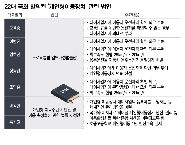 △전동 킥보드 등 '개인형 이동장치'(PM)의 최고 속도를 현행 시속 25km에서 시속 20km로 낮추고 △술에 취한 상태에서 개인형 이동장치를 운전하는 경우 자동차 음주운전과 동일하게 처벌하며 △대여사업자가 개인형 이동장치를 대여할 때 이용자의 운전 자격을 확인하도록 하는 등의 내용으로 대부분 지난 21대 국회 때도 발의됐던 법안이다. 이번 국회에서도 국회 행정안전위원회에 회부됐으나 아직 한 차례도 논의되지 않았다.