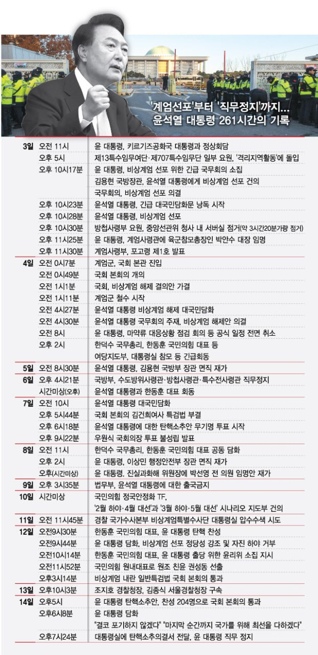 현재 윤 대통령은 대통령실이 아닌 관저에 머무는 것으로 알려졌다. 그사이 검찰과 경찰, 고위공직자수사처 등의 수사엔 속도가 붙었다. 이들은 경쟁적으로 12·3 비상계엄 사태 연루자들에 대한 출국금지, 긴급체포 등에 나섰다. 지난 10일엔 법무부가 윤 대통령에 대한 출국금지 명령도 내렸다. 현직 대통령에 대한 첫 출국금지 명령으로, 전 세계적으로도 거의 유례가 없다.