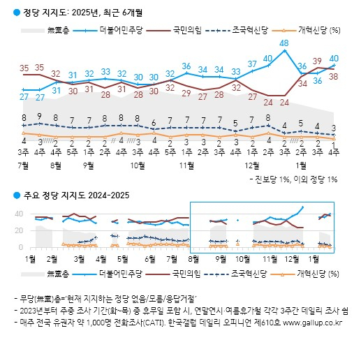 27일 여론조사업체 한국갤럽이 전국 만18세 이상 유권자 1001명을 상대로 조사한 2015년 1월 넷째 주 여론조사 결과에 따르면 국민의힘의 지지율은 38%로 집계됐다. 직전 조사와 비교하면 1%P(포인트) 하락한 수치다. 더불어민주당 40%와 비교하면 오차범위내에서 접전을 벌이고 있다.
