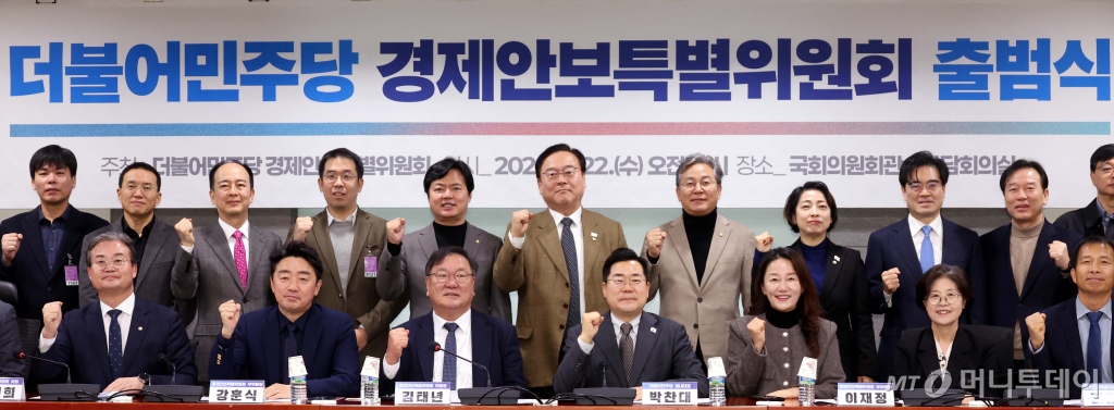 ![[서울=뉴시스] 조성봉 기자= 박찬대 더불어민주당 원내대표와 김태년 위원장을 비롯한 위원들이 22일 오전 서울 여의도 국회에서 열린 경제안보특별위원회 출범식에서 기념촬영을 하고 있다. 2025.01.22. suncho21@newsis.com /사진=조성봉](https://thumb.mt.co.kr/cdn-cgi/image/f=avif/21/2025/02/2025021914492242711_1.jpg)