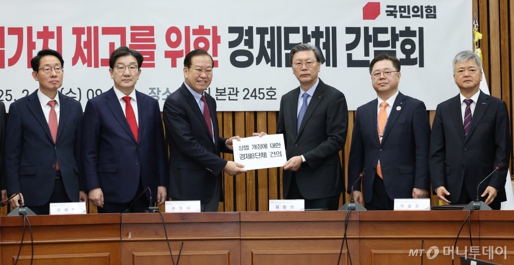 이 자리에는 권영세 국민의힘 비대위원장, 권성동 국민의힘 원내대표를 비롯해 한국경제인연합회, 대한상공회의소, 한국무역협회, 한국중견기업연합회, 한국상장회사협의회, 한국경영자총협회, 중소기업중앙회, 코스닥 협회 등 8개 단체가 참여했다.