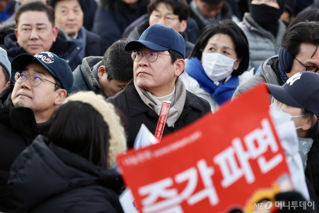 ![[서울=뉴시스]이재명 더불어민주당 대표가 28일 오후 서울 종로구 광화문 동십자각 일대에서 열린 ‘윤석열 즉각 퇴진! 사회대개혁! 4차 범시민 대행진’ 집회에 박찬대 원내대표와 김민석 최고위원 등과 함께 참석해 있다. 2024.12.28.](https://thumb.mt.co.kr/cdn-cgi/image/f=avif/21/2025/02/2025022813375192458_1.jpg)