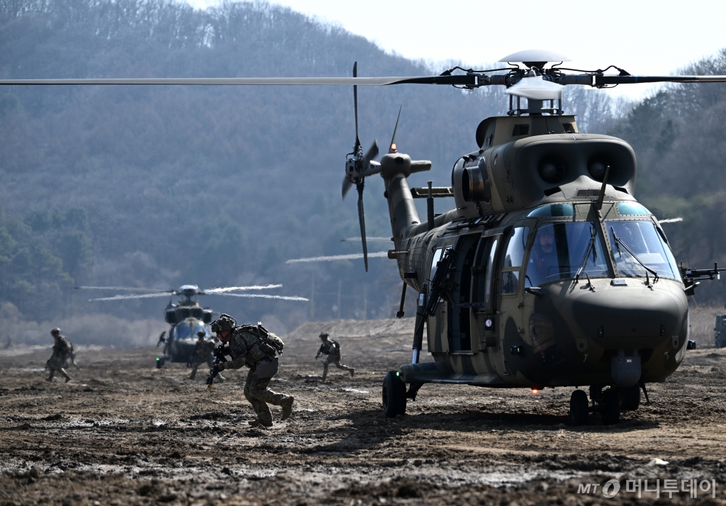 11일 오후 1시30분 경기 파주 무건리 훈련장. 육군 제1보병사단 무적칼여단과 미국 육군 제2사단 스트라이커여단 등 한미 장병 약 200명이 무장을 마치고 집결했다. 한미 연합군이 수리온 기동헬기(KUH-1) 6대와 BO-105경전투헬기 2대 등에 올라타자 헬기는 굉음과 먼지를 일으키며 날아올랐다. 수리온은 경전투헬기의 엄호를 받으며 이동했고 장병들은 작전지역에서 헬기 레펠을 타고 현장에 투입됐다.