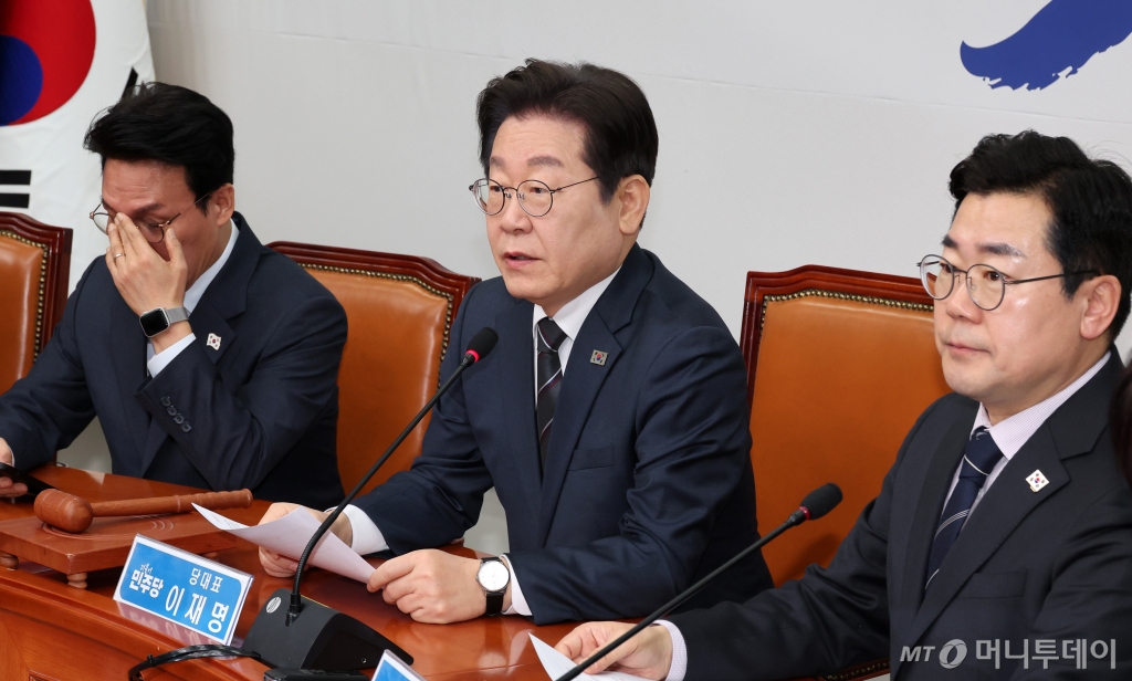 ![[서울=뉴시스] 조성우 기자 = 이재명(가운데) 더불어민주당 대표가 12일 오전 서울 여의도 국회에서 열린 최고위원회의에서 발언하고 있다. 2025.03.12. xconfind@newsis.com /사진=조성우](https://thumb.mt.co.kr/cdn-cgi/image/f=avif/21/2025/03/2025031210394194828_1.jpg)