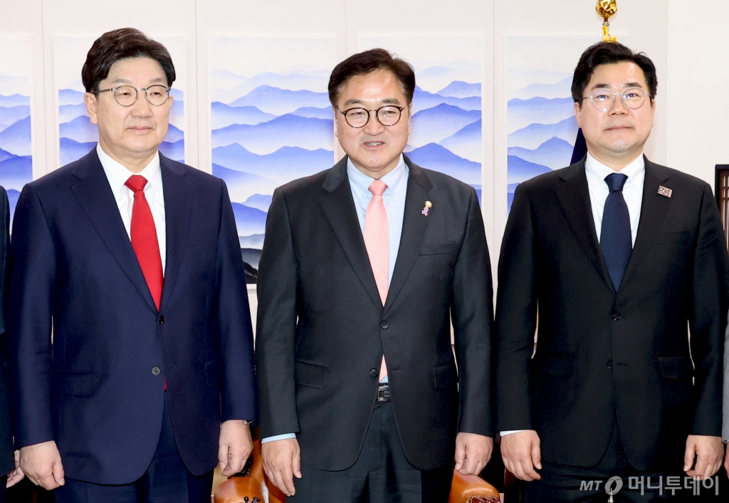우 의장은 이날 오전 서울 여의도 국회 본관에서 권성동 국민의힘 원내대표, 박찬대 더불어민주당 원내대표 간 회동을 주재했다. 이 자리에는 김상훈 국민의힘 정책위의장과 박형수 국민의힘 원내수석부대표, 진성준 민주당 정책위의장, 박성준 원내수석부대표도 배석했다.