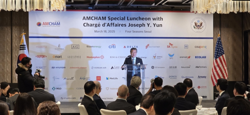 조셉 윤 주한미국대사대리는 18일 서울 종로구 포시즌스호텔에서 열린 주한미국상공회의소(암참) 초청 특별 간담회에서 미국의 대(對)한국 관세 정책과 관련해 "한국이 미국산 제품 수입을 늘리고 비관세 장벽을 완화해야 한다"며 이같이 말했다.
