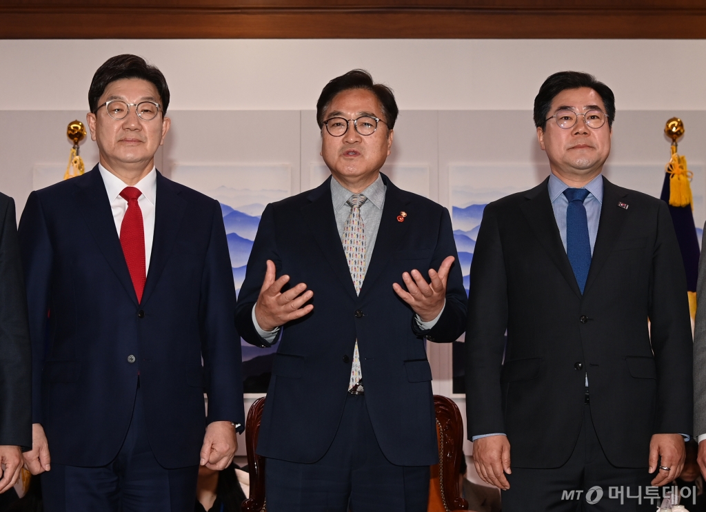 ![[서울=뉴시스] 조성봉 기자 = 우원식(가운데) 국회의장과 권성동(왼쪽) 국민의힘 원내대표, 박찬대 더불어민주당 원내대표가 18일 오전 서울 여의도 국회에서 열린 여야회동에서 기념촬영하고 있다.(공동취재) 2025.03.18. photo@newsis.com /사진=조성봉](https://thumb.mt.co.kr/cdn-cgi/image/f=avif/21/2025/03/2025031815355560161_1.jpg)