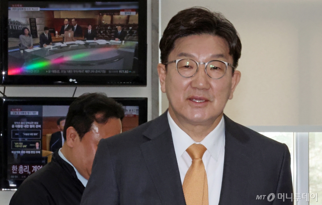 ![[서울=뉴시스] 조성우 기자 = 권성동 국민의힘 원내대표가 24일 오전 서울 여의도 국회 원내대표실에 들어선 가운데 모니터에 한덕수 국무총리 탄핵심판 선고 관련 뉴스가 나오고 있다. 2025.03.24. xconfind@newsis.com /사진=조성우](https://thumb.mt.co.kr/cdn-cgi/image/f=avif/21/2025/03/2025032410162373265_1.jpg)