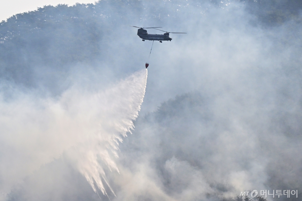 ![[산청=뉴시스] 차용현 기자 = 경남 산청군에서 발생한 대형 산불이 4일째로 접어든 24일 오전 아침이 밝아오자 산불진화에 투입된 군용 헬기가 진화작업을 펼치고 있다. 2025.03.24. con@newsis.com /사진=차용현](https://thumb.mt.co.kr/cdn-cgi/image/f=avif/21/2025/03/2025032413512432844_1.jpg)