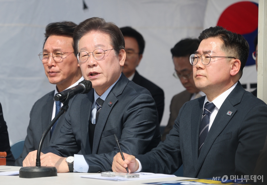 ![[서울=뉴시스] 김명년 기자 = 이재명 더불어민주당 대표가 24일 오전 서울 광화문 천막당사에서 열린 최고위원회의에 참석해 모두발언을 하고 있다.(공동취재) 2025.03.24.](https://thumb.mt.co.kr/cdn-cgi/image/f=avif/21/2025/03/2025032416314216168_1.jpg)