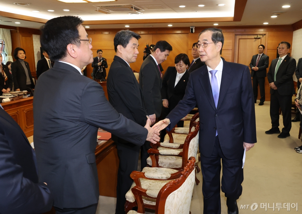 ![[서울=뉴시스] 조수정 기자 = 한덕수 대통령 권한대행 국무총리가 24일 정부서울청사에서 열린 국무위원간담회에 참석하며 최상목 부총리 겸 기획재정부 장관과 인사하고 있다. (대통령실통신사진기자단) 2025.03.24. chocrystal@newsis.com /사진=조수정](https://thumb.mt.co.kr/cdn-cgi/image/f=avif/21/2025/03/2025032417522071706_1.jpg)