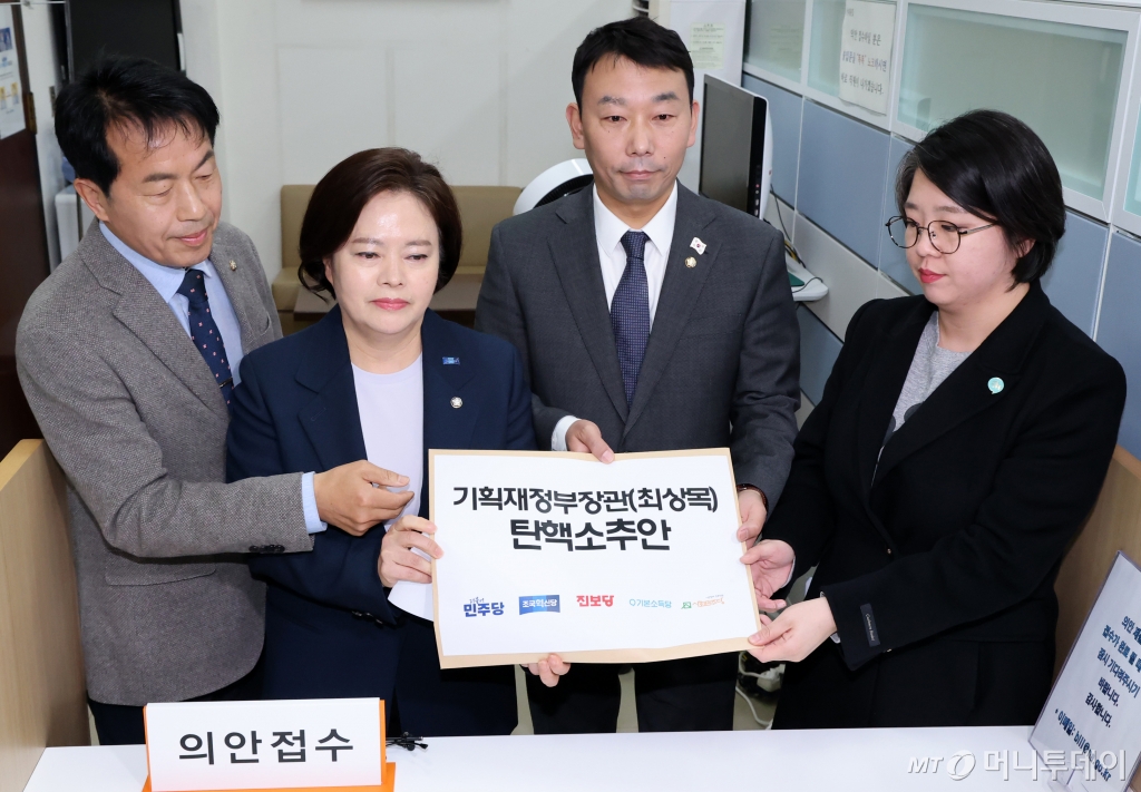 ![[서울=뉴시스] 조성봉 기자= 용혜인(오른쪽부터) 기본소득당 대표, 김용민 더불어민주당 원내정책수석부대표, 정춘생 조국혁신당 원내수석부대표, 윤종오 진보당 원내대표가 21일 오후 서울 여의도 국회 의안과에 최상목 대통령 권한대행 경제부총리 겸 기획재정부 장관 탄핵소추안을 제출하고 있다.(공동취재) 2025.03.21. photo@newsis.com /사진=](https://thumb.mt.co.kr/cdn-cgi/image/f=avif/21/2025/03/2025032508550818590_1.jpg)