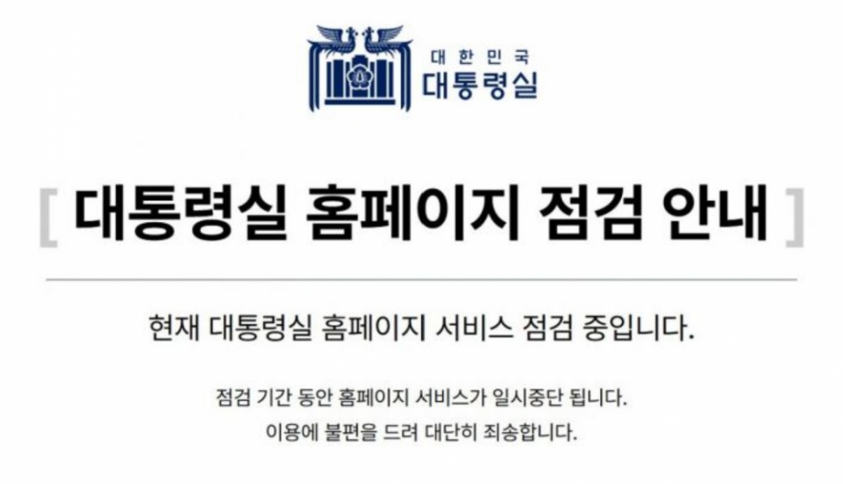 대통령실 홈페이지는 5일 오전 운영이 중단됐다. 이날 오후 3시 현재 대통령실 홈페이지에 접속하면 '현재 대통령실 홈페이지 서비스 점검 중입니다. 점검 기간 동안 홈페이지 서비스가 일시중단됩니다'라는 안내문만 나온다.