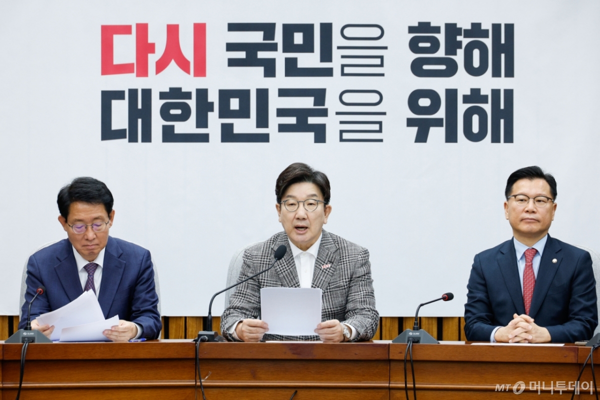 권 원내대표는 "어제 대법원은 이재명 대표의 2심 무죄 판결을 강하게 질타하면서 질책하고 유죄 취지로 파기환송을 했다"며 "직후 민주당은 긴급대응 의총(의원총회)을 열었다"고 했다. 이어 "국민 앞에 석고대죄를 해도 모자란 상황에서 민주당이 국민께 들이민 것은 충격적이게도 최상목 경제부총리와 심우정 검찰총장 탄핵이었다"라고 밝혔다.