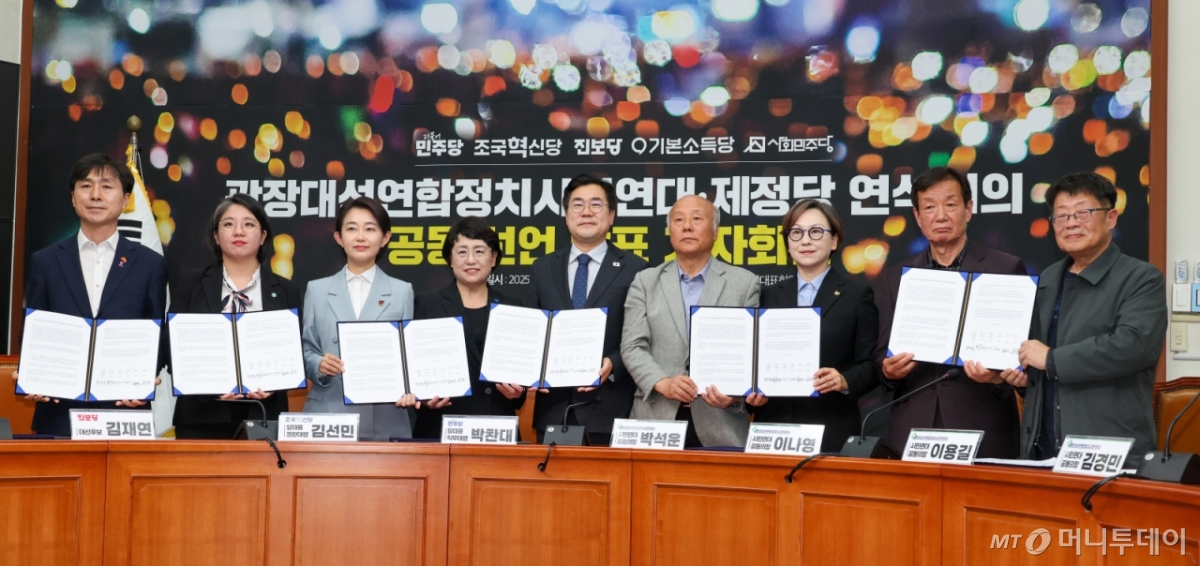한편 5개 정당과 시민연대는 공동 선언을 통해 △내란 특검 추진 △반헌법행위 특별조사 위원회 설치 △거부권 행사 법안 재추진 △결선투표제 도입 및 원내교섭단체 기준완화 추진 △국민참여형 개헌 추진 등 사안을 약속했다.