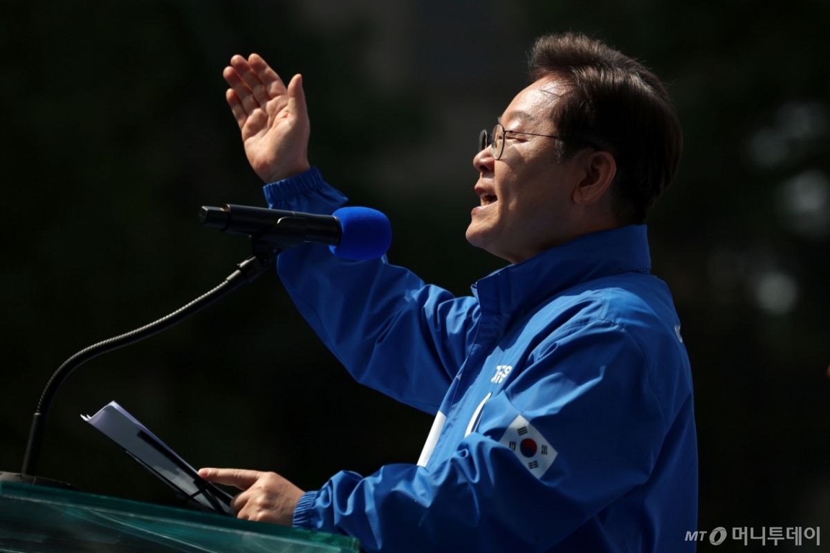 ![[서울=뉴시스] 조성우 기자 = 이재명 더불어민주당 대선후보가 제21대 대통령선거 공식 선거운동이 시작된 12일 오전 서울 청계광장에서 열린 중앙선거대책위원회 출정식 및 첫 유세에서 시민들에 지지를 호소하고 있다. (공동취재) 2025.05.12. photo@newsis.com /사진=류현주](https://thumb.mt.co.kr/cdn-cgi/image/f=avif/21/2025/05/2025051216422751104_3.jpg)