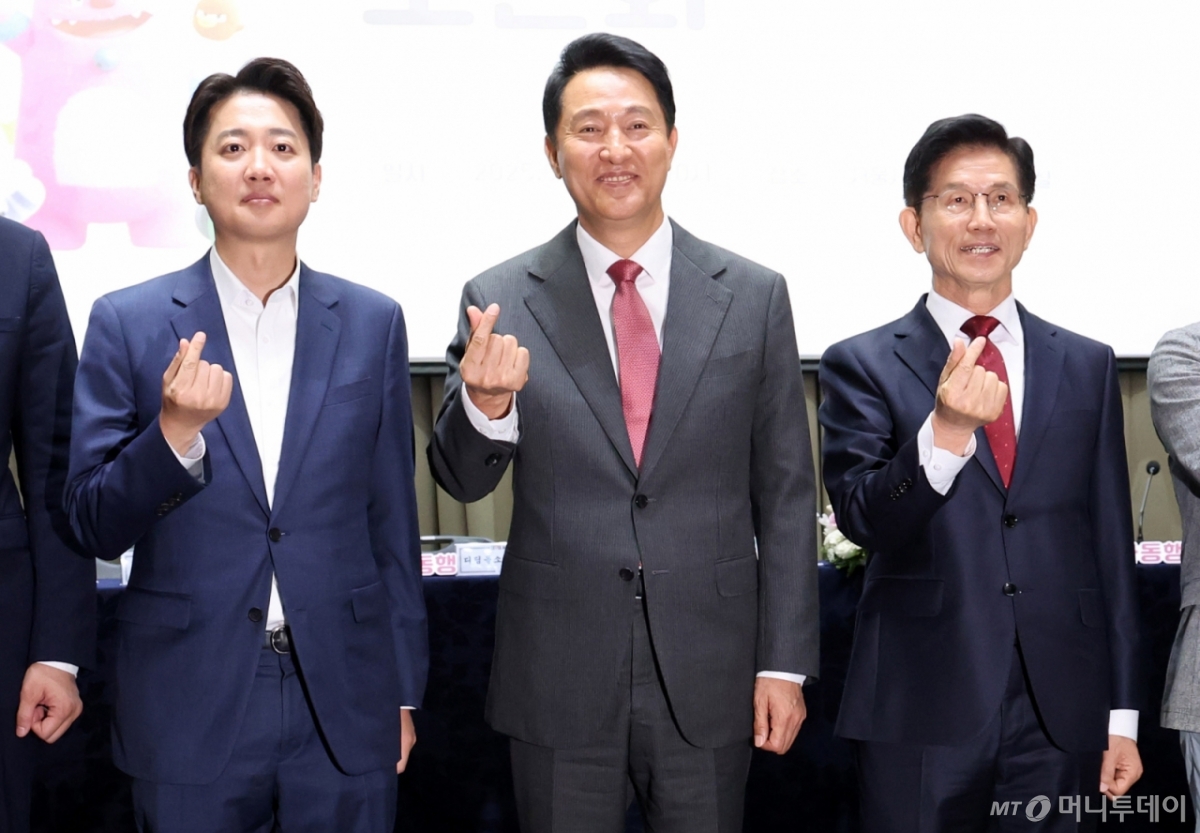 ![[서울=뉴시스] 추상철 기자 = 김문수 국민의힘 대선 후보와 이준석 개혁신당 대선 후보가 19일 오전 서울 중구 서울시청에서 열린 '약자와 동행하는 서울' 토론회에서 오세훈 서울시장과 함께 기념촬영을 하고 있다. 2025.05.19. scchoo@newsis.com /사진=추상철](https://thumb.mt.co.kr/cdn-cgi/image/f=avif/21/2025/05/2025051911490768798_1.jpg)
