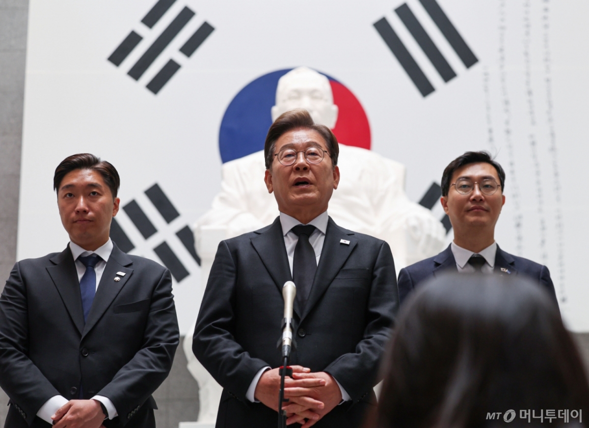 ![[서울=뉴시스] 권창회 기자 = 이재명 더불어민주당 대선 후보가 19일 서울 용산구 백범김구 묘역을 방문해 참배를 마친 뒤 백브리핑을 하고 있다. 2025.05.19. kch0523@newsis.com /사진=권창회](https://thumb.mt.co.kr/cdn-cgi/image/f=avif/21/2025/05/2025051912342165468_1.jpg)