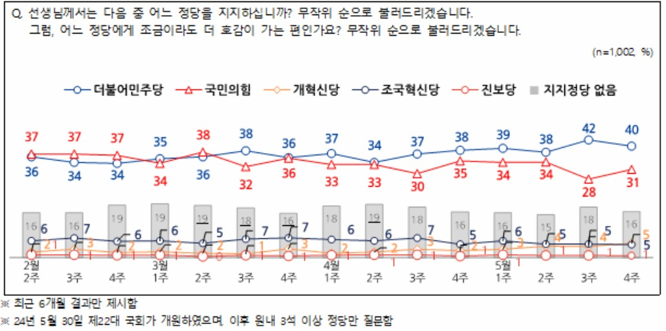 정당 지지도는 민주당 40%, 국민의힘 31%, 조국혁신당 5%, 개혁신당 5% 등 순으로 나타났다. 전주 대비 민주당이 2%p 내리고, 국민의힘은 3%p 내려 양당간 지난주 격차는 14p에서 9p로 좁혀졌다.