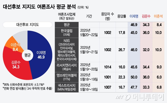 23일 머니투데이 더300(the300)이 5월 16~22일 중 전화 면접 방식(통신 3사 무작위 번호 추출)으로 이뤄진 총 5개 여론조사 결과의 평균을 산출한 결과 대선후보 지지율 평균은 이재명 후보가 46.9%로 가장 높았다. 이어 김문수 후보 34.3%, 이준석 후보 8.4% 등으로 집계됐다.