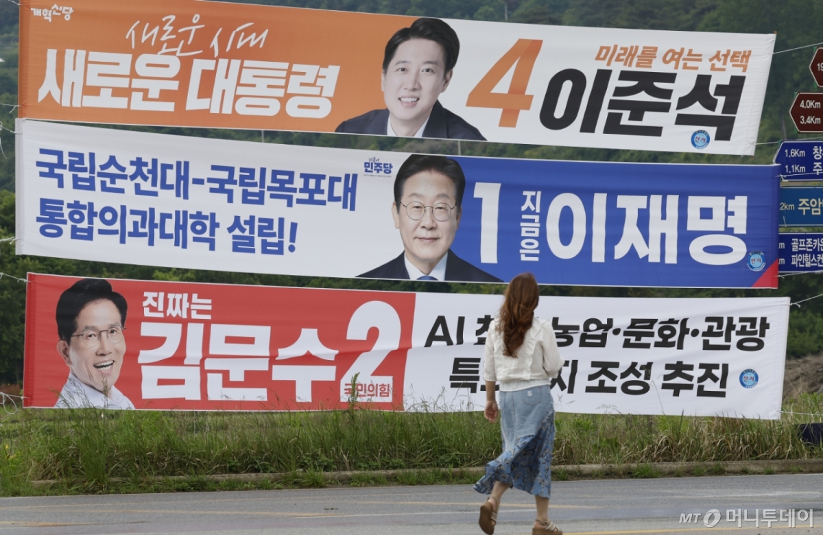 제21대 대통령선거를 8일 앞둔 26일 대선 후보들에 대한 지지율 조사 결과 이재명 더불어민주당 후보가 47%, 김문수 국민의힘 후보가 40%로 나타났다. 이준석 개혁신당 후보는 10%대 지지율을 보였다.
