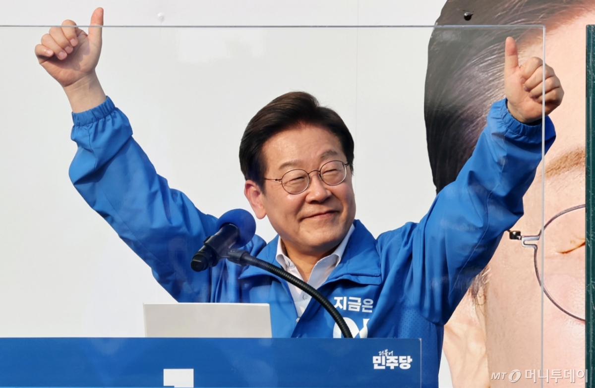 ![[서울=뉴시스] 조성우 기자 = 이재명 더불어민주당 대선후보가 29일 오후 서울 서초구 서울고속버스터미널광장에서 열린 유세에서 엄지를 치켜 들며 시민들에게 인사하고 있다. 2025.05.29. xconfind@newsis.com /사진=조성우](https://thumb.mt.co.kr/cdn-cgi/image/f=avif/21/2025/05/2025053010294013716_1.jpg)