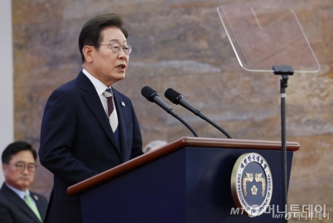 ![[서울=뉴시스] 국회사진기자단 = 이재명 대통령이 4일 서울 여의도 국회 로텐더홀에서 열린 제21대 대통령 취임 선서식에 참석해 취임사 하고 있다. 2025.06.04. photo@newsis.com /사진=](https://thumb.mt.co.kr/cdn-cgi/image/f=avif/21/2025/06/2025060422031783763_1.jpg)