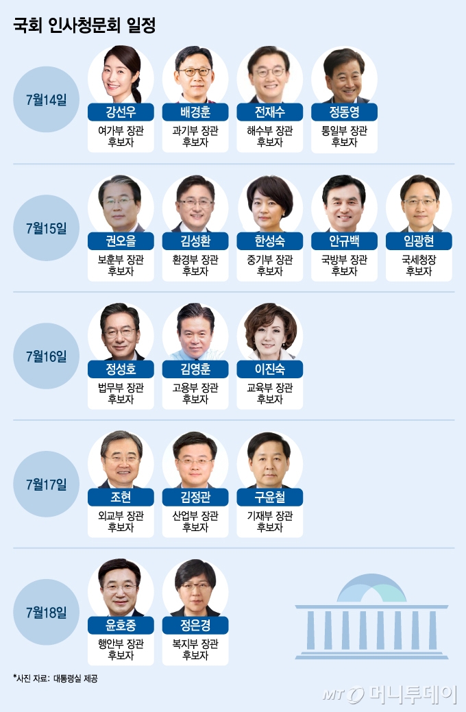 16개 부처 장관 및 국세청장 후보자에 대한 인사청문회가 다음 주 순차적으로 진행된다. 여당인 더불어민주당은 집권 초기 정부의 원활한 국정 운영을 위해 낙마자 없이 청문회를 마무리 짓겠다는 구상이지만 국민의힘은 자체 인사 검증 기구를 꾸리며 송곳 검증을 벼르고 있다.