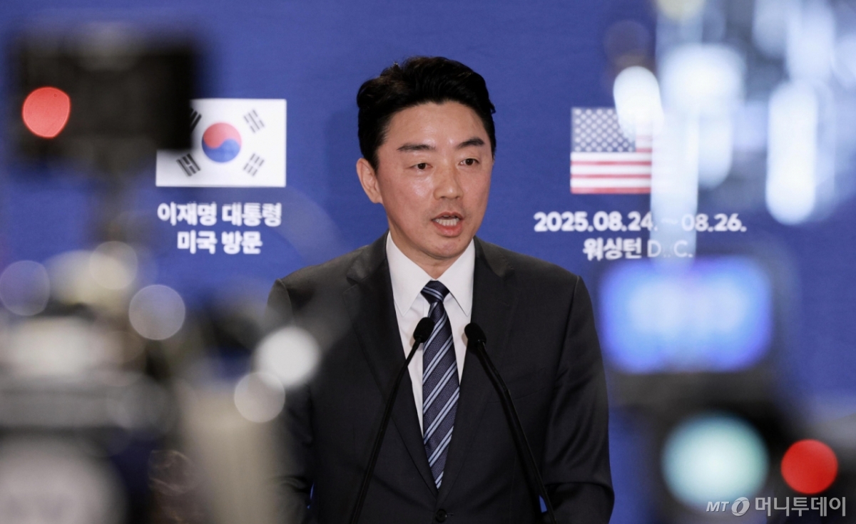 ![[워싱턴=뉴시스] 고범준 기자 = 강훈식 비서실장이 25일(현지 시간) 미국 워싱턴D.C 프레스센터 내 중앙기자실에서 한미 정상회담 관련 브리핑을 하고 있다. 2025.08.26. bjko@newsis.com /사진=고범준](https://thumb.mt.co.kr/cdn-cgi/image/f=avif/21/2025/08/2025082816002599274_1.jpg)