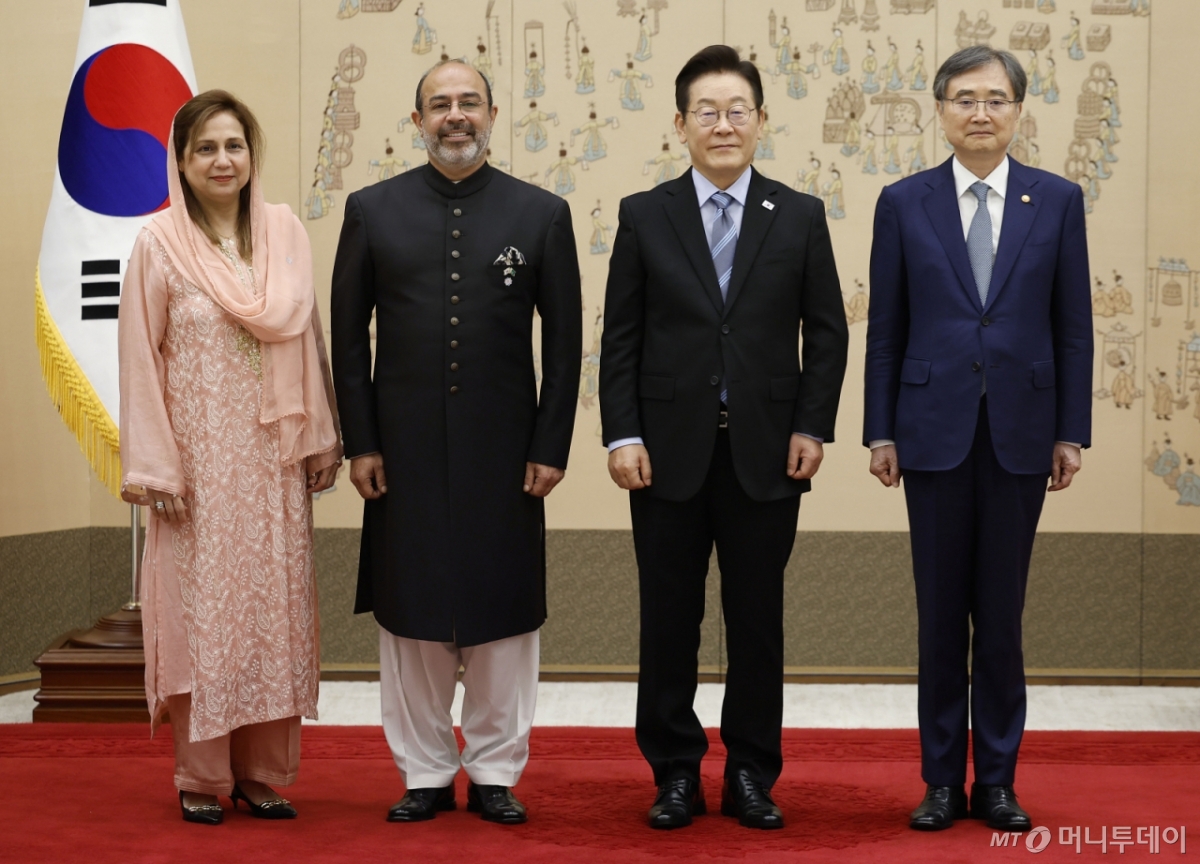 ![[서울=뉴시스] 최동준 기자 = 이재명 대통령이 2일 서울 용산 대통령실 청사에서 열린 주한대사 신임장 제정식에서 사예드 모아잠 샤(왼쪽 두번째) 주한 파키스탄 대사로부터 신임장을 전달받은 뒤 기념촬영하고 있다. 2025.09.02. photocdj@newsis.com /사진=최동준](https://thumb.mt.co.kr/cdn-cgi/image/f=avif/21/2025/09/2025090215462088787_1.jpg)