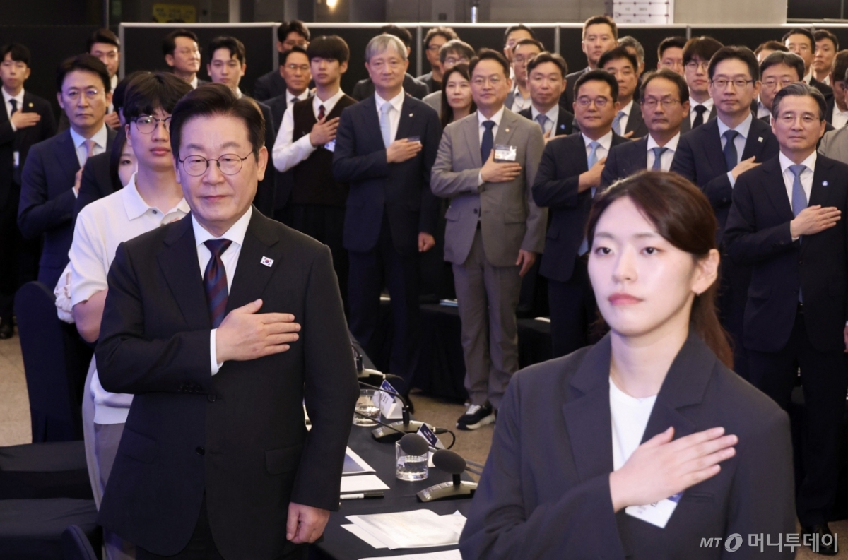 [서울=뉴시스] 고범준 기자 = 이재명 대통령이 10일 서울 마포구 프론트원에서 열린 국민성장펀드 보고대회에서 국민의례를 하고 있다. (대통령실통신사진기자단) 2025.09.10. bjko@newsis.com /사진=