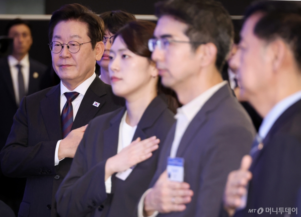[서울=뉴시스] 고범준 기자 = 이재명 대통령이 10일 서울 마포구 프론트원에서 열린 국민성장펀드 보고대회에서 국민의례를 하고 있다. (대통령실통신사진기자단) 2025.09.10. bjko@newsis.com /사진=