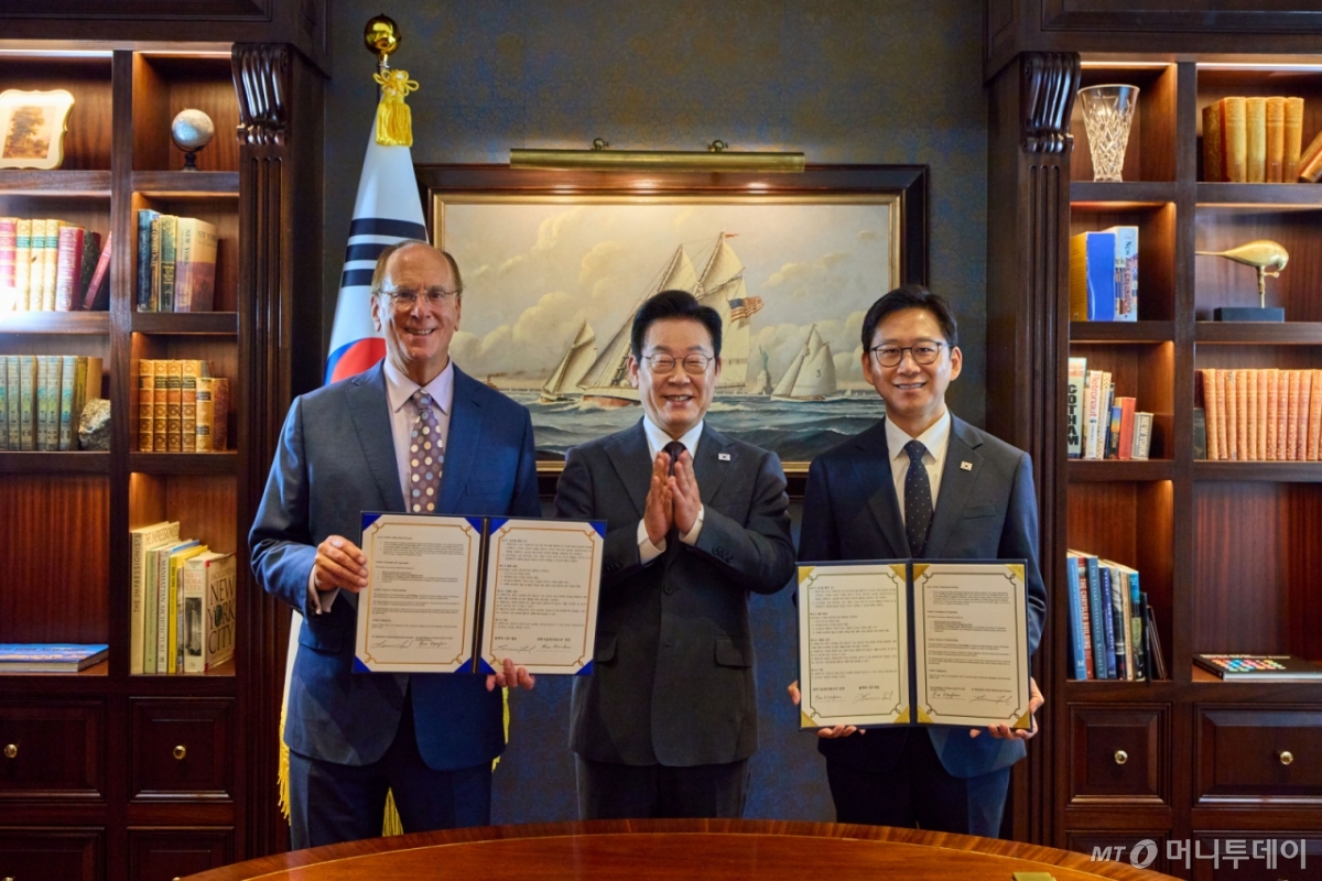 ![[뉴욕=뉴시스] 최동준 기자 = 이재명 대통령이 22일(현지 시간) 미국 뉴욕의 한 호텔에서 배경훈 과학기술정보통신부 장관과 세계경제포럼 의장인 래리 핑크 블랙록 회장의 AI 산업 글로벌 협력을 위한 MOU 체결 때 박수를 치고 있다. (공동취재) 2025.09.23. photocdj@newsis.com /사진=최동준](https://thumb.mt.co.kr/cdn-cgi/image/f=avif/21/2025/09/2025092307074811766_1.jpg)