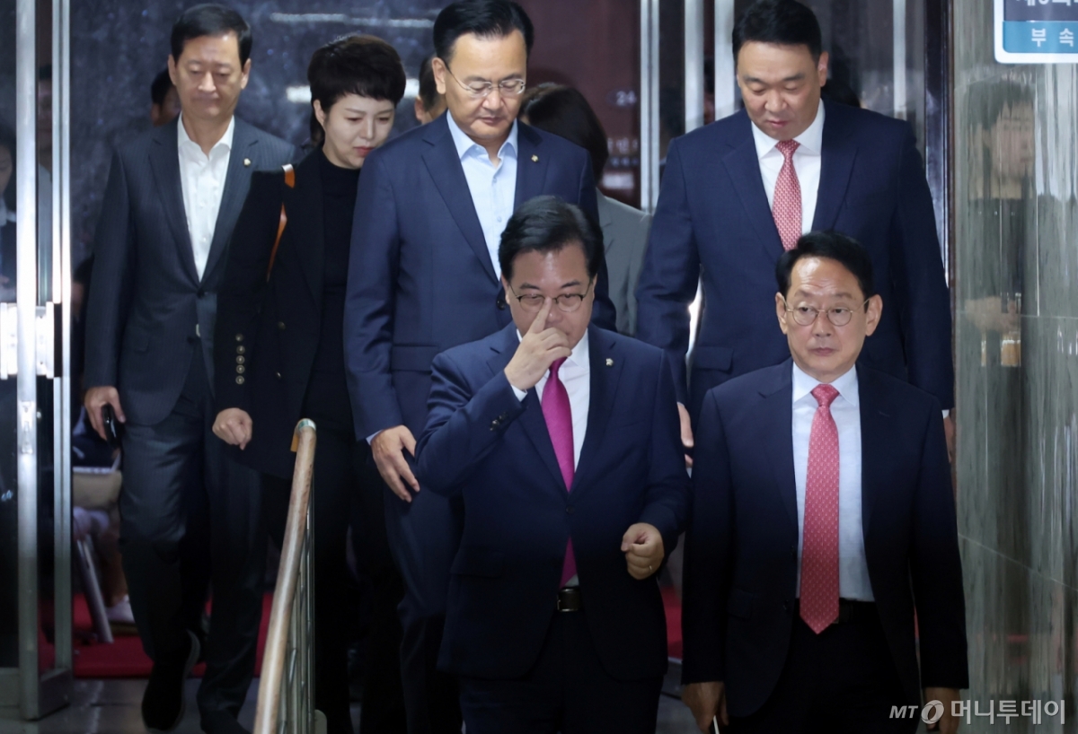 ![[서울=뉴시스] 고승민 기자 = 국민의힘 송언석 원내대표와 김도읍 정책위의장 등 원내지도부가 23일 서울 여의도 국회에서 열린 원내대책회의에 참석하고 있다. 2025.09.23. kkssmm99@newsis.com /사진=고승민](https://thumb.mt.co.kr/cdn-cgi/image/f=avif/21/2025/09/2025092309582046989_1.jpg)