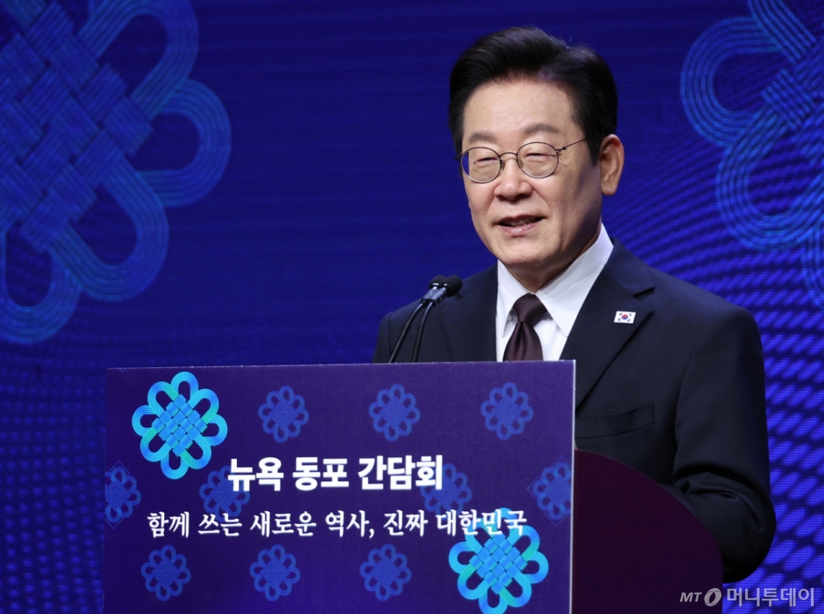 ![[뉴욕=뉴시스] 최동준 기자 = 이재명 대통령이 22일(현지 시간) 미국 뉴욕의 한 호텔에서 열린 동포 간담회에서 인사말을 하고 있다. 2025.09.23.](https://thumb.mt.co.kr/cdn-cgi/image/f=avif/21/2025/09/2025092316274125709_1.jpg)