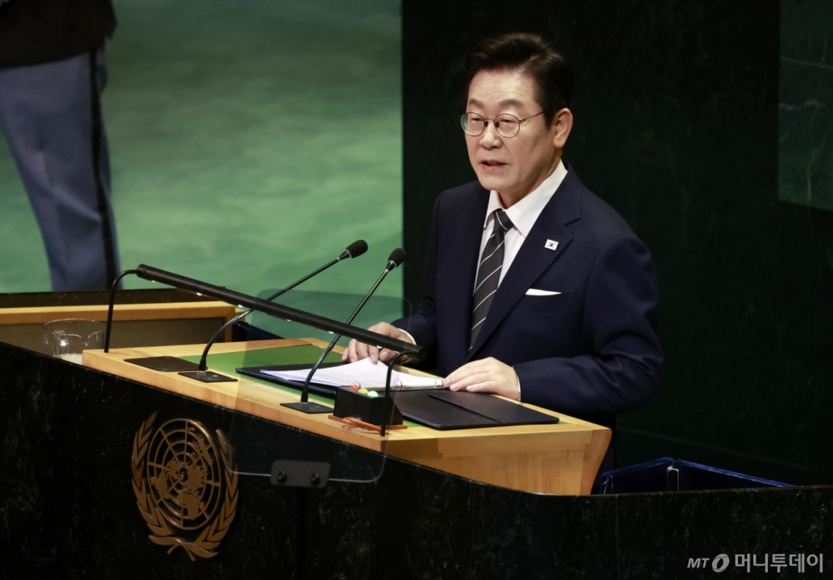 ![[뉴욕=뉴시스] 최동준 기자 = 이재명 대통령이 23일(현지 시간) 미국 뉴욕 유엔 본부에서 열린 제80차 유엔 총회에서 기조연설을 하고 있다. 2025.09.24. photocdj@newsis.com /사진=최동준](https://thumb.mt.co.kr/cdn-cgi/image/f=avif/21/2025/09/2025092410451934874_1.jpg)