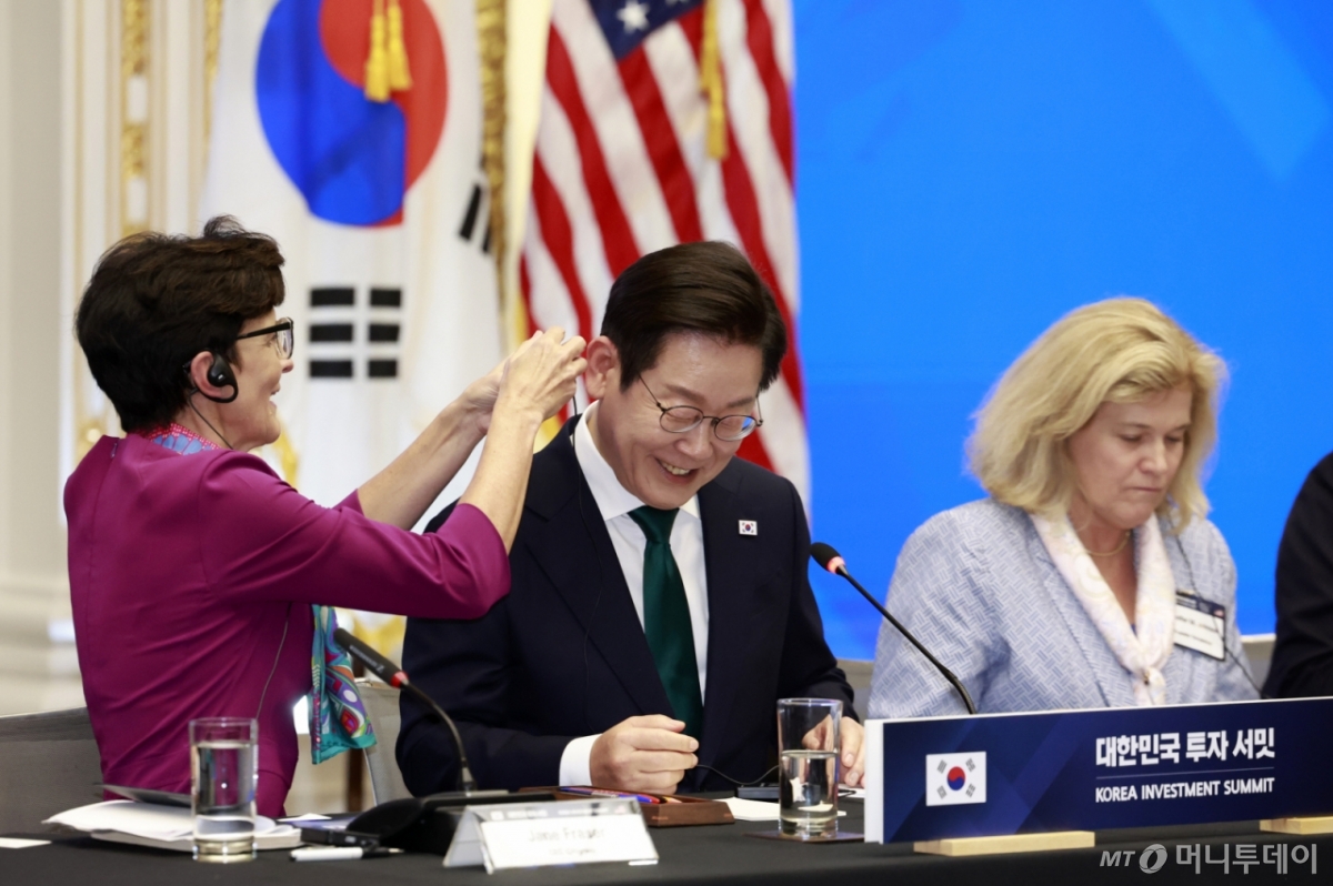 [뉴욕=뉴시스] 최동준 기자 = 이재명 대통령이 25일(현지 시간) 미국 뉴욕 증권거래소에서 열린 대한민국 투자 써밋에서 제인 프레이저(Jane Fraser) 씨티그룹 최고경영자에게 번역기 착용을 도움받고 있다. 2025.09.25. [email protected] /사진=최동준