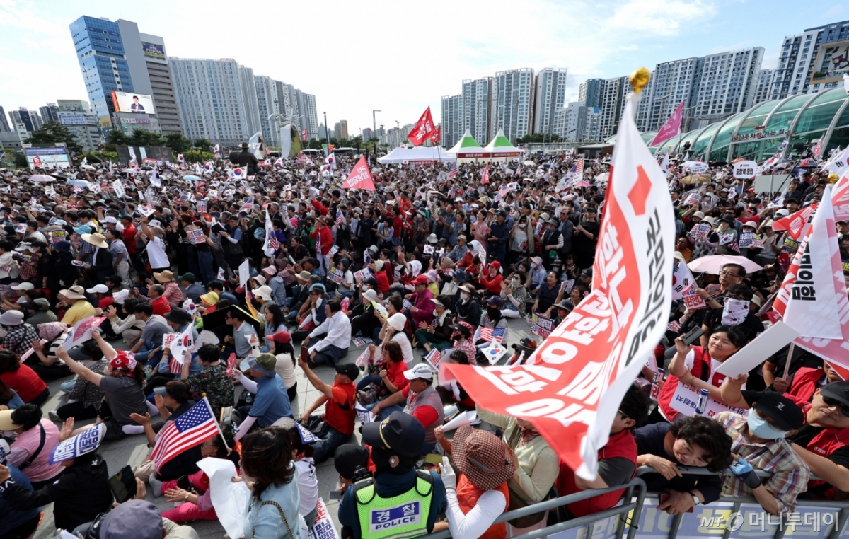 ![[대구=뉴시스] 이무열 기자 = 21일 대구 동구 동대구역 광장에서 열린 야당탄압·독재정치 국민 규탄대회에서 참석자들이 구호를 외치고 있다. 2025.09.21. lmy@newsis.com /사진=이무열](https://thumb.mt.co.kr/cdn-cgi/image/f=avif/21/2025/09/2025092614333138743_1.jpg)