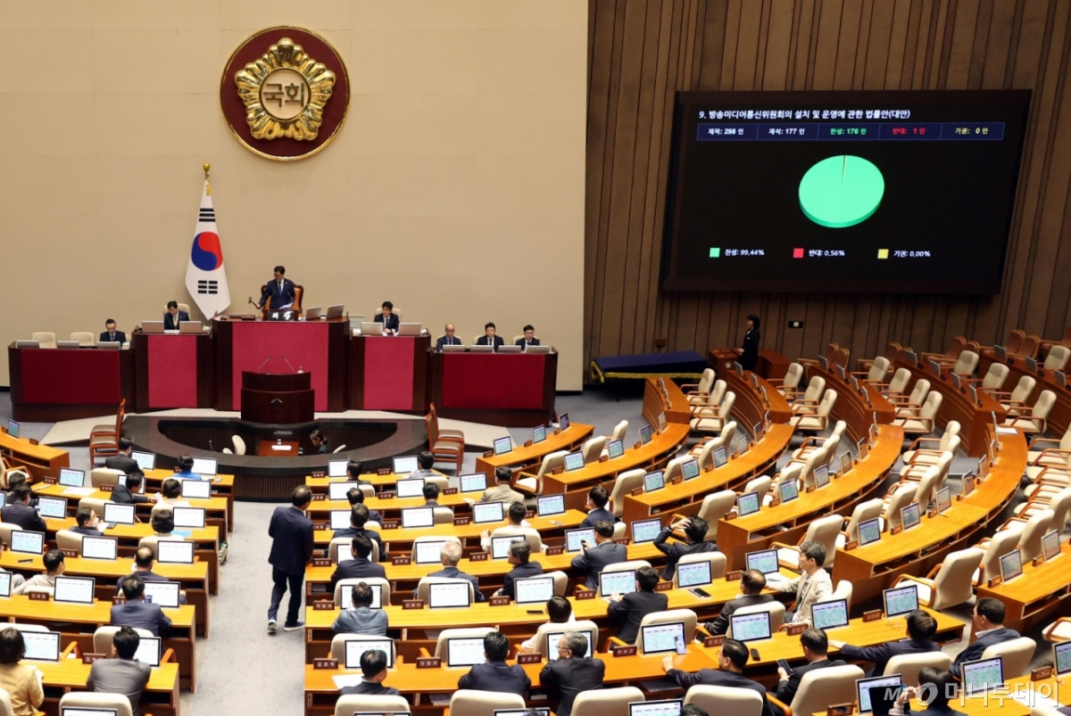 ![[서울=뉴시스] 조성봉 기자 = 27일 오후 서울 여의도 국회에서 열린 본회의에서 방송미디어통신위원회의 설치 및 운영에 관한 법률안(대안)이 재적 298인, 재석 177인 찬성176인 반대 1인으로 통과되고 있다. 2025.09.27. suncho21@newsis.com /사진=조성봉](https://thumb.mt.co.kr/cdn-cgi/image/f=avif/21/2025/09/2025092719211247997_1.jpg)